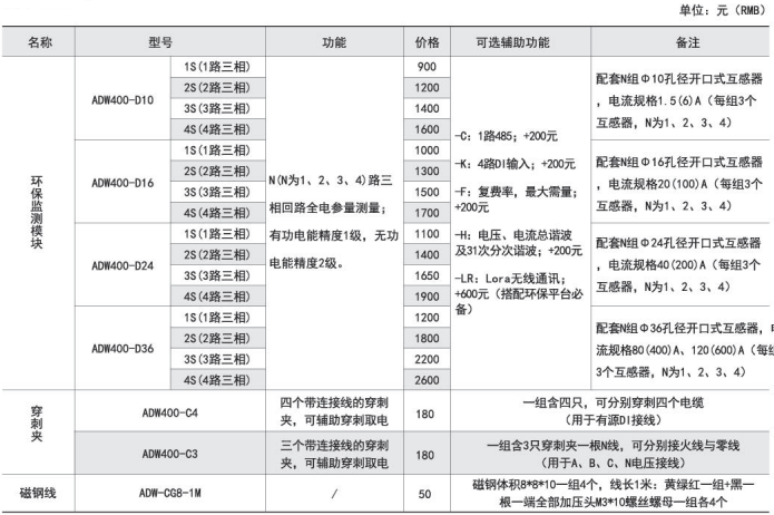 ADW400方便用戶進(jìn)行用電監(jiān)測、集抄和管理,特別適合環(huán)保監(jiān)管類的廠區(qū)智能監(jiān)管改造項(xiàng)目,可廣泛應(yīng)用于化工廠、制藥廠、鋼鐵廠、養(yǎng)殖廠等產(chǎn)污制污的工廠。訂貨范例:
