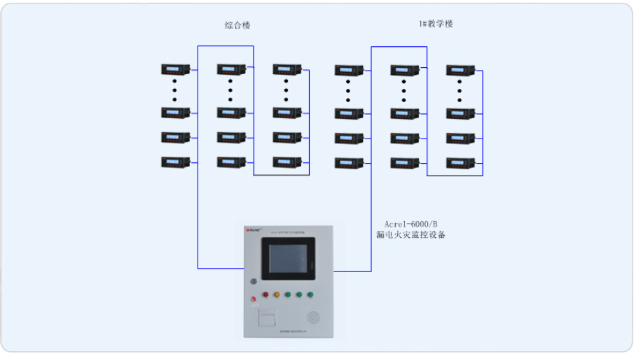 本項目主要是針對上海復(fù)旦高等藝術(shù)實訓(xùn)基地內(nèi)的兩棟教學(xué)樓設(shè)計電氣火災(zāi)監(jiān)控系統(tǒng)。在部分樓層配電柜的重要回路安裝安科瑞研發(fā)的ARCM系列剩余電流式電氣火災(zāi)監(jiān)控探測器,并為其配置一套Acrel-6000/B電氣火災(zāi)監(jiān)控系統(tǒng),電氣火災(zāi)監(jiān)控系統(tǒng)實時監(jiān)測重要回路的剩余電流值、箱體回路的實時溫度,監(jiān)測的數(shù)據(jù)實時傳輸至后臺主機(jī),當(dāng)發(fā)生剩余電流值越限、溫度越限時,后臺能進(jìn)行聲光報警,同時后臺能夠和消防火災(zāi)報警系統(tǒng)實現(xiàn)消防聯(lián)動。