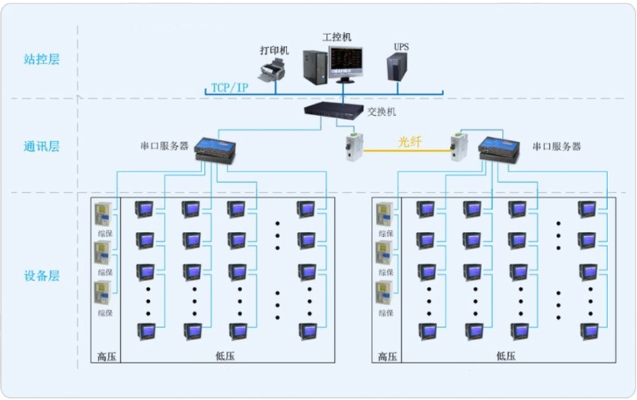 本系統主要監測新建3.6萬KL/年精品啤酒項目聯合車間,該車間共有2組變壓器。3臺AM5微機保護裝置,5只ACR330ELH、41只ACR120EL、4只PZ72L-AI3多功能電力儀表接入電能管理系統。通訊總線直接接入變電所內串口服務器,從而儀表與監控主機的數據連通。安科瑞電氣股份有限公司為其配置一套Acrel-3000電能管理系統,實時監測變電所內各個回路的電流、電壓、功率、開關狀態等電參量,由此達到變電所少人值守或無人值守的智能化管理。