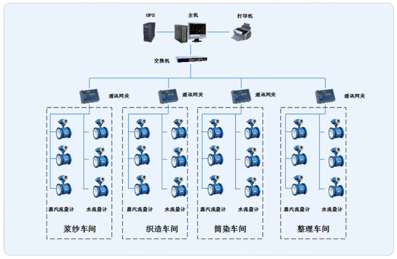 系統(tǒng)采用Acrel-5000型能耗監(jiān)測系統(tǒng),整個系統(tǒng)采用網(wǎng)絡(luò)分布式結(jié)構(gòu),監(jiān)控主機(jī)位于現(xiàn)場數(shù)據(jù)機(jī)房中,現(xiàn)場主要監(jiān)測儀表為水、蒸汽的流量計,位于現(xiàn)場4個生產(chǎn)車間內(nèi)。該項目實(shí)現(xiàn)了常州強(qiáng)聲紡織有限公司內(nèi)能源的智能管理。所有監(jiān)控設(shè)備均通過屏蔽雙絞線至各自車間內(nèi)的通訊管理機(jī),再通過光電轉(zhuǎn)換器經(jīng)過光纖將數(shù)據(jù)傳輸至數(shù)據(jù)中心,從而實(shí)現(xiàn)遠(yuǎn)程監(jiān)控。