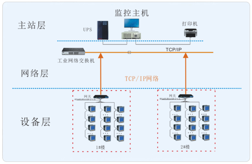 系統采用Acrel-5000能耗管理系統,該系統主要采用分層分布式計算機網絡結構,如系統結構:站控管理層、網絡通訊層和現場設備層。其中上海環境監測中心項目現場設備分布為1#樓及2#樓,該所有監測點都在樓層強電井的配電箱內,所有儀表通過485屏蔽雙絞線鋪設至值班室,經采集器至系統主機從而完成儀表數據的采集并管理。